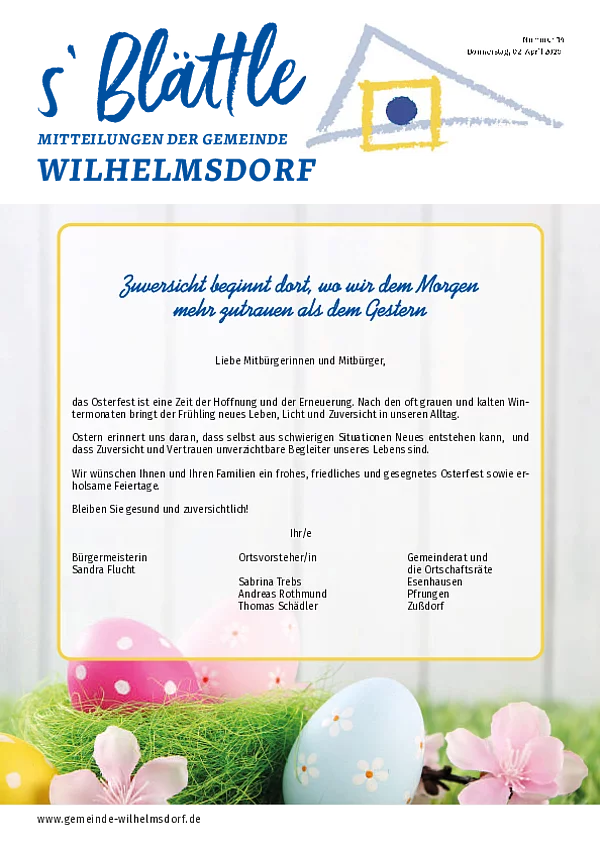 Gedruckt wird das Mitteilungsblatt vom Primo-Verlagsdruck, Stockach, Telefon 07771 9317-11. Bestellungen nimmt Frau Schneider, Telefon 07503 921-133 entgegen, Anzeigenaufträge richten Sie bitte an Frau Deuchert, Telefon 07503 921-111 oder per E-Mail an amtsblatt@gemeinde-wilhelmsdorf.de.