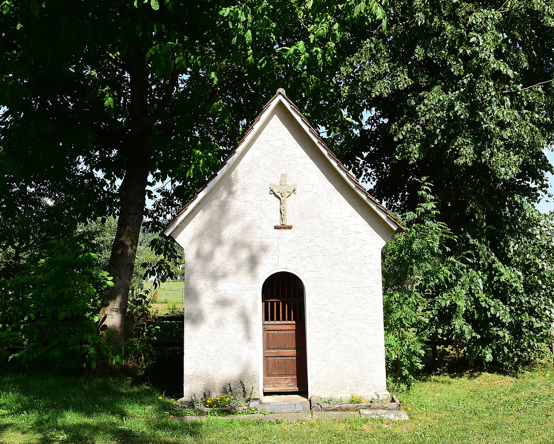 Die Weg- und Hofkapelle wurde im 19. Jhd. erbaut. Der kleine Putzbau wurde in traditioneller Bauweise errichtet. Die hölzernen Andachtsfiguren im Innern, ein Kruzifix, eine Madonna, die hl. Barbara und der hl. Antonius, stammen aus der Zeit nach 1900. Das über der Tür eingemauerte Kruzifix ist dagegen älter, vermutlich aus dem 17. oder frühen 18. Jhd.