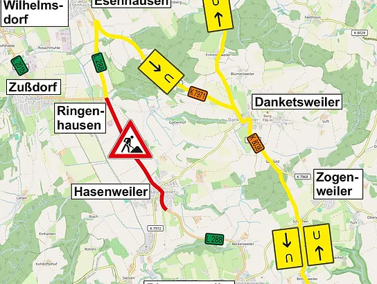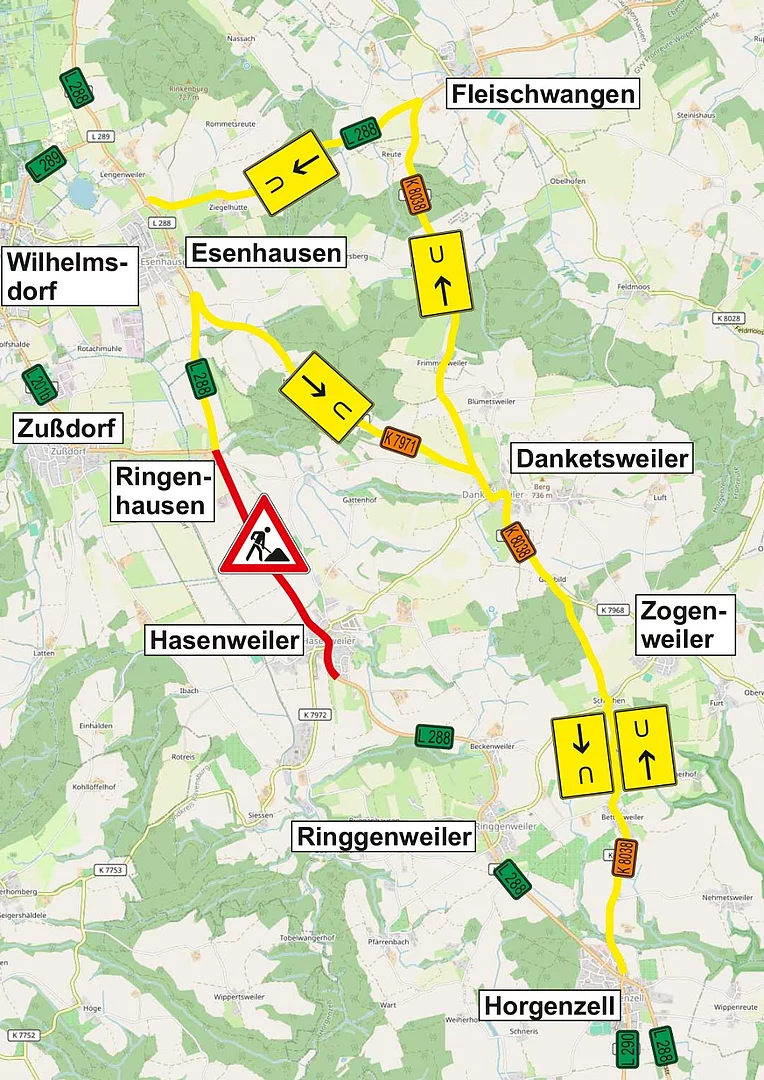 In dieser Zeit bleibt die L 288 zwischen Ringenhausen und Hasenweiler voll gesperrt. In Hasenweiler ist dann die L 288 ab der Einmündung der K 7972 aus Richtung Deggenhausertal in Richtung Ravensburg wieder befahrbar.