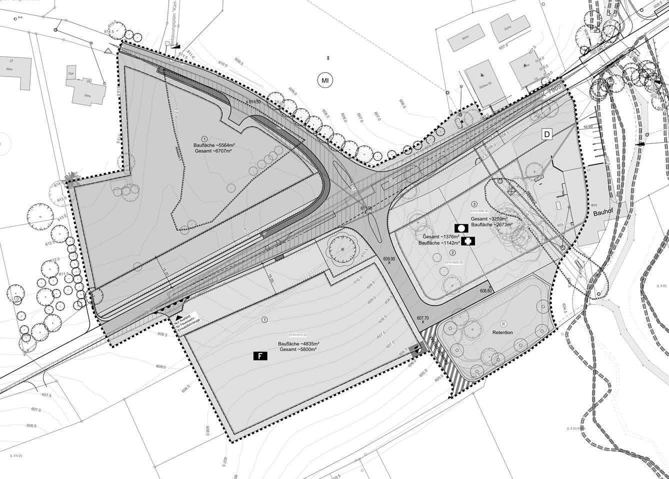 - Anpassung der drei eingetragenen Straßenhöhen südlich und westlich des Bauquartiers der geplanten DRK-Rettungswache.