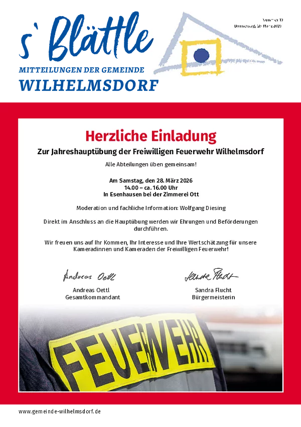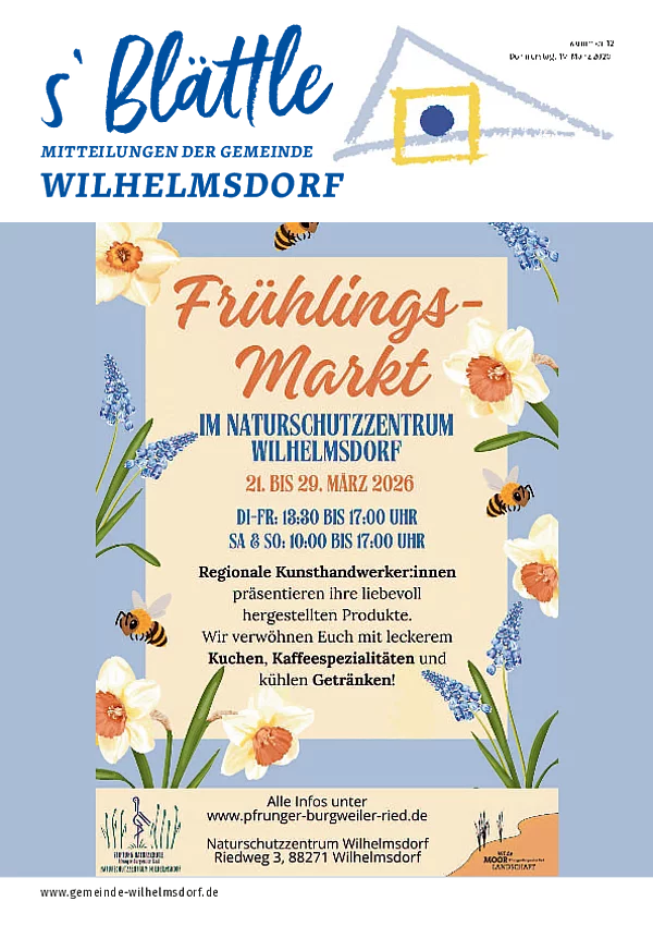 Gedruckt wird das Mitteilungsblatt vom Primo-Verlagsdruck, Stockach, Telefon 07771 9317-11. Bestellungen nimmt Frau Schneider, Telefon 07503 921-133 entgegen, Anzeigenaufträge richten Sie bitte an Frau Deuchert, Telefon 07503 921-111 oder per E-Mail an amtsblatt@gemeinde-wilhelmsdorf.de.