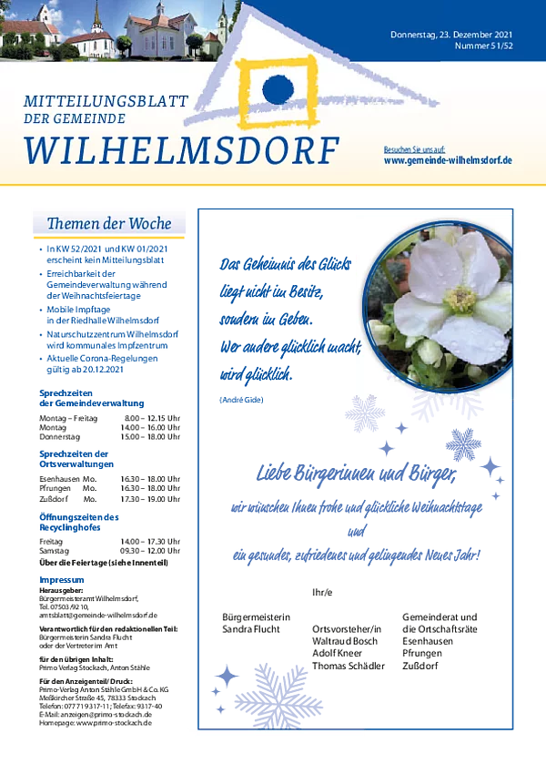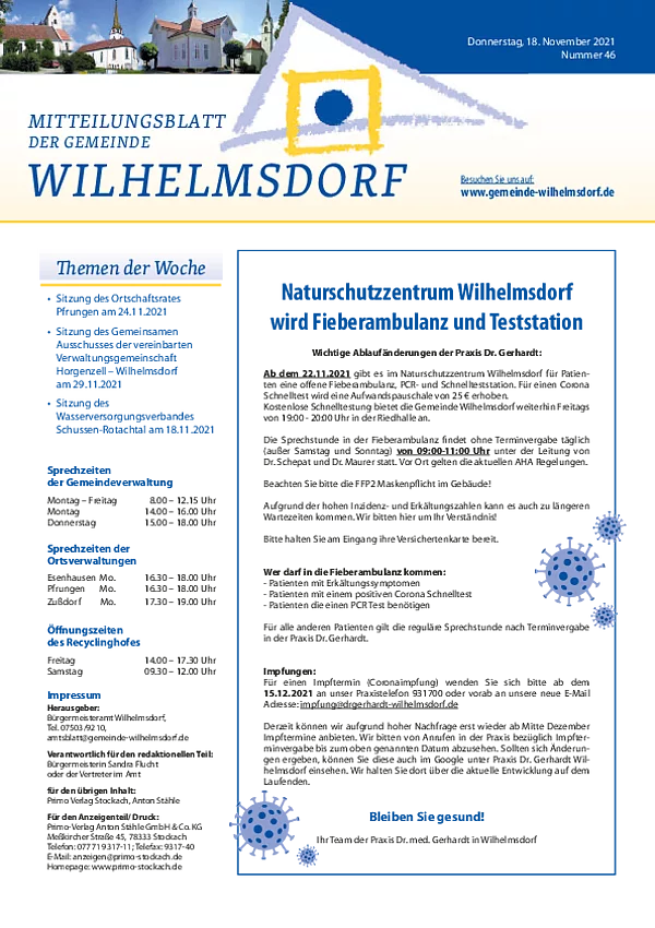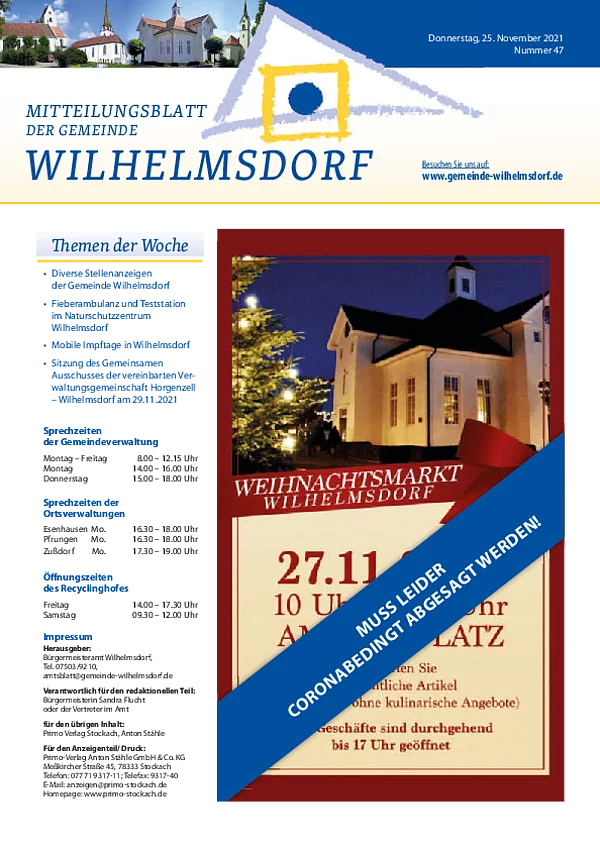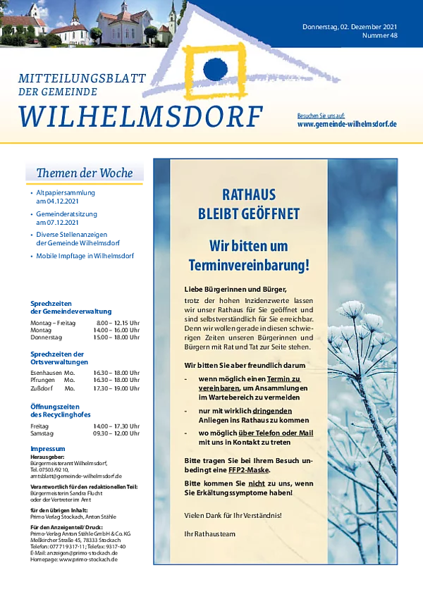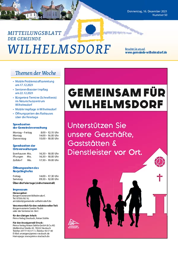 Gedruckt wird das Mitteilungsblatt vom Primo-Verlagsdruck, Stockach, Telefon 07771 9317-11. Bestellungen nimmt Frau Schneider, Telefon 07503 921-133 entgegen, Anzeigenaufträge richten Sie bitte an Frau Deuchert, Telefon 07503 921-111 oder per E-Mail an amtsblatt@gemeinde-wilhelmsdorf.de.