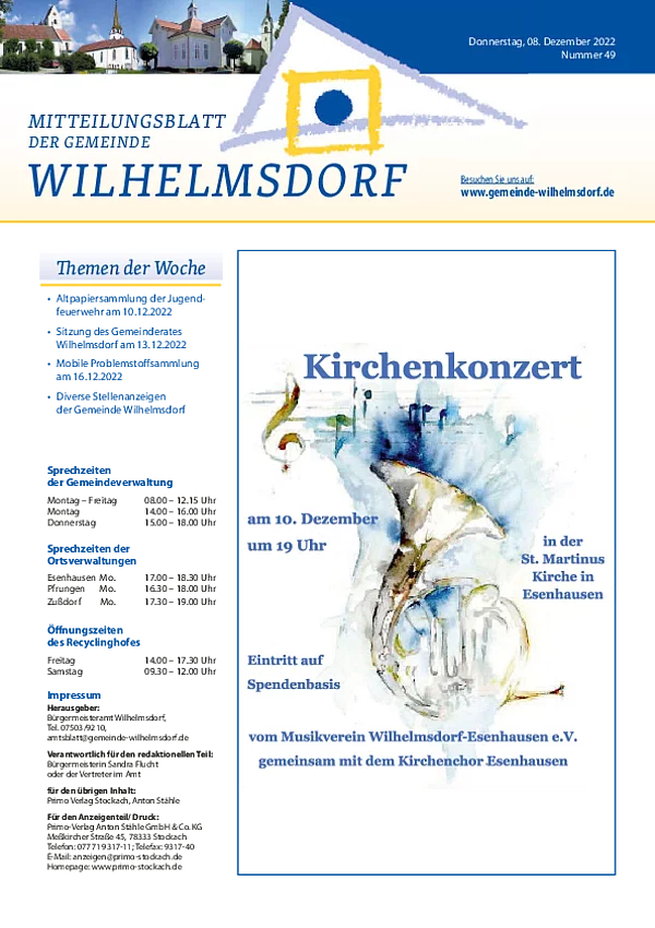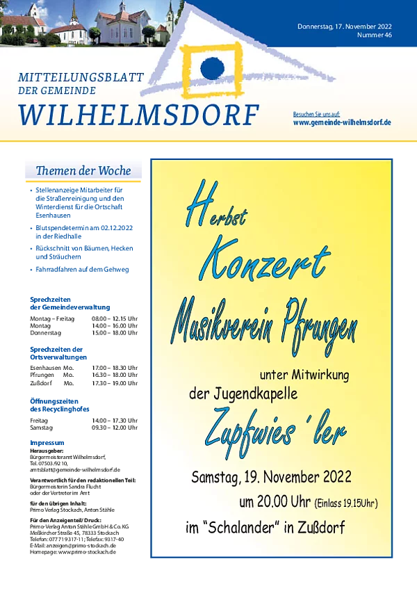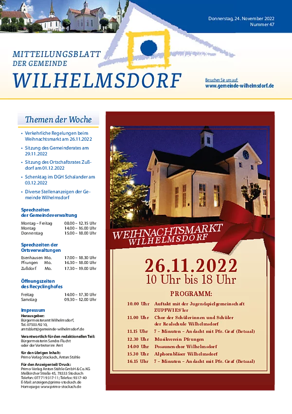 Gedruckt wird das Mitteilungsblatt vom Primo-Verlagsdruck, Stockach, Telefon 07771 9317-11. Bestellungen nimmt Frau Schneider, Telefon 07503 921-133 entgegen, Anzeigenaufträge richten Sie bitte an Frau Deuchert, Telefon 07503 921-111 oder per E-Mail an amtsblatt@gemeinde-wilhelmsdorf.de.