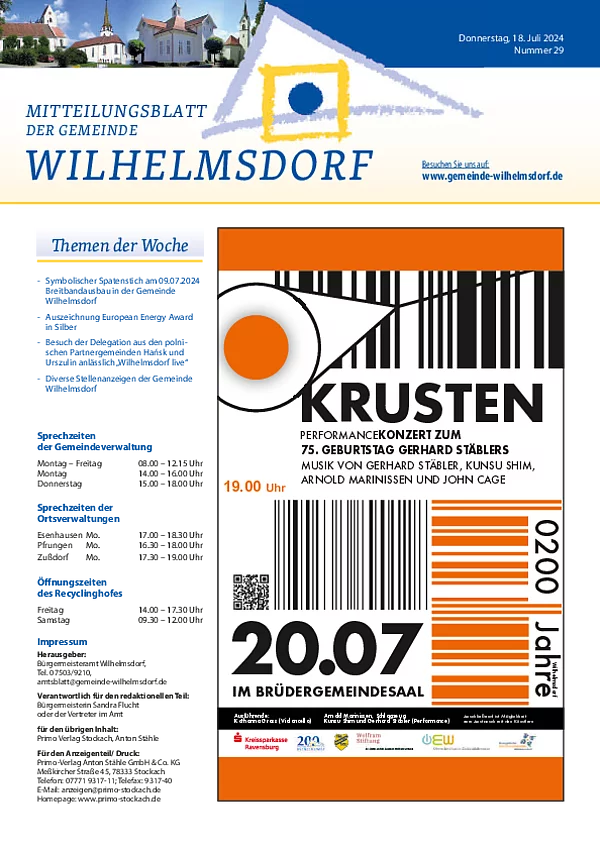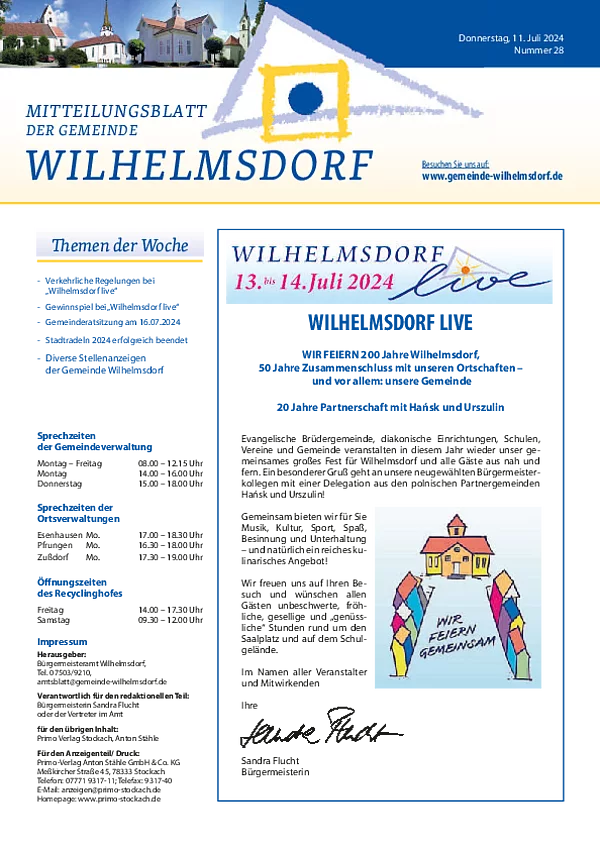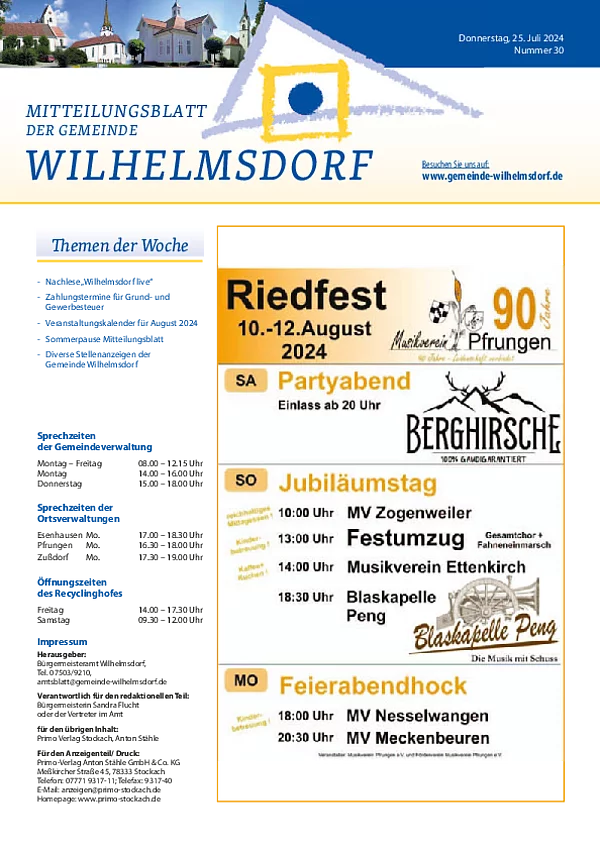 Gedruckt wird das Mitteilungsblatt vom Primo-Verlagsdruck, Stockach, Telefon 07771 9317-11. Bestellungen nimmt Frau Schneider, Telefon 07503 921-133 entgegen, Anzeigenaufträge richten Sie bitte an Frau Deuchert, Telefon 07503 921-111 oder per E-Mail an amtsblatt@gemeinde-wilhelmsdorf.de.
