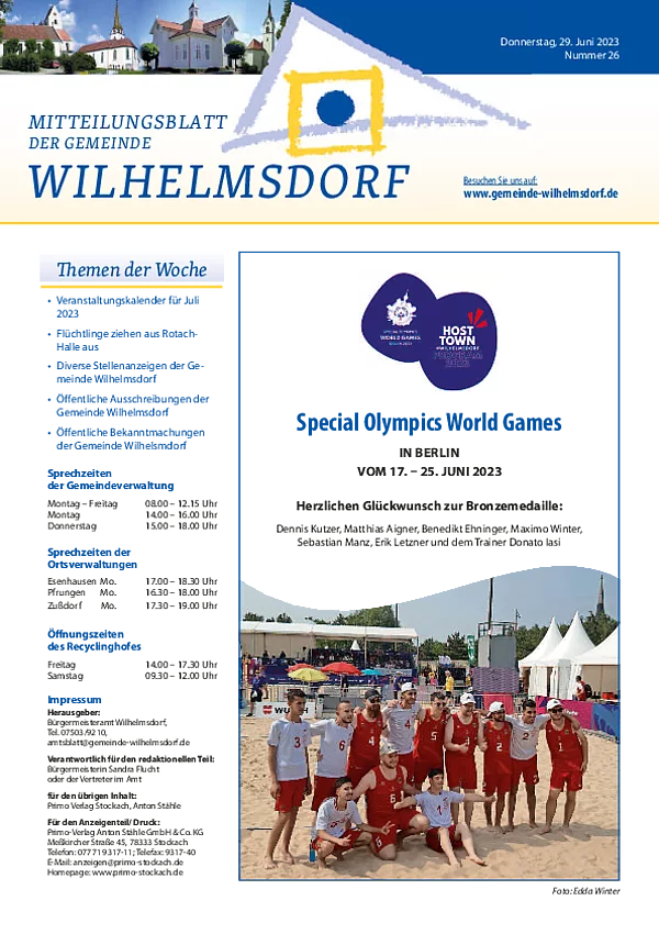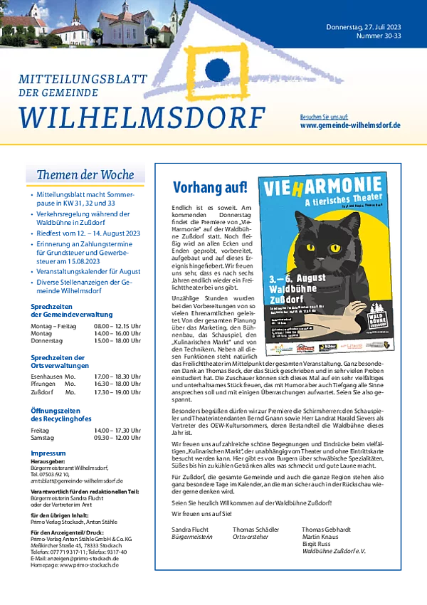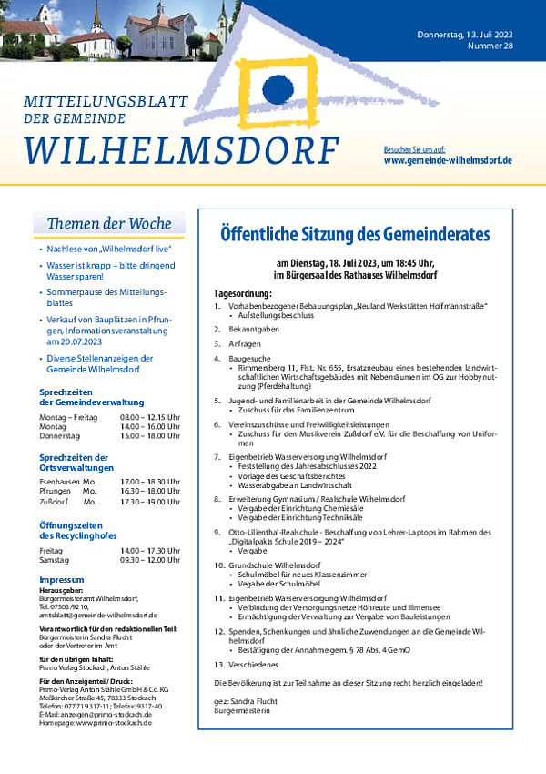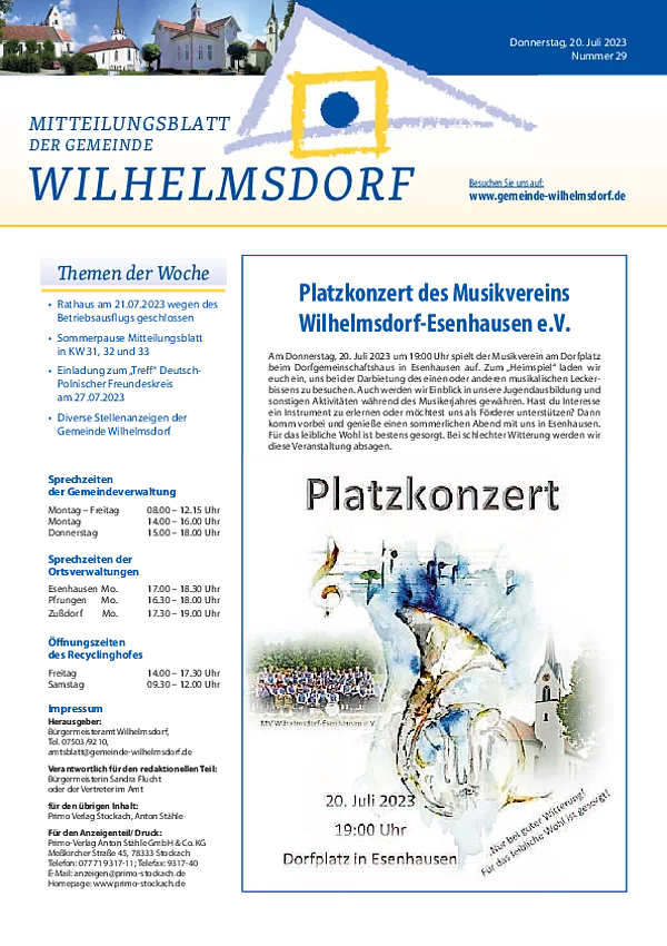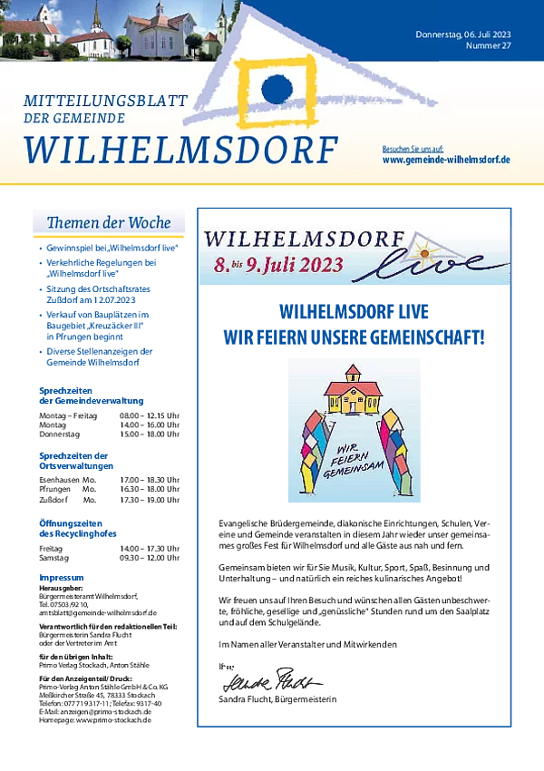 Gedruckt wird das Mitteilungsblatt vom Primo-Verlagsdruck, Stockach, Telefon 07771 9317-11. Bestellungen nimmt Frau Schneider, Telefon 07503 921-133 entgegen, Anzeigenaufträge richten Sie bitte an Frau Deuchert, Telefon 07503 921-111 oder per E-Mail an amtsblatt@gemeinde-wilhelmsdorf.de.