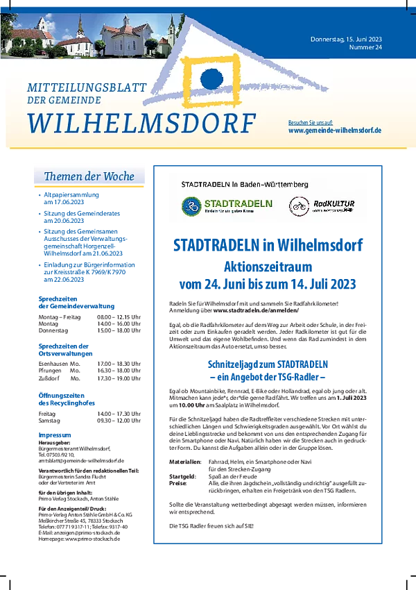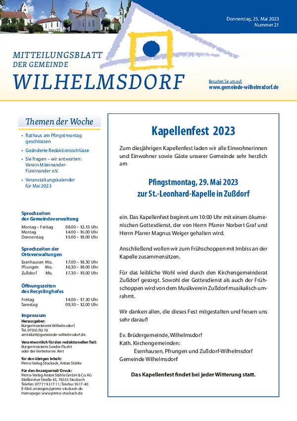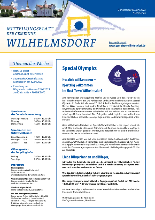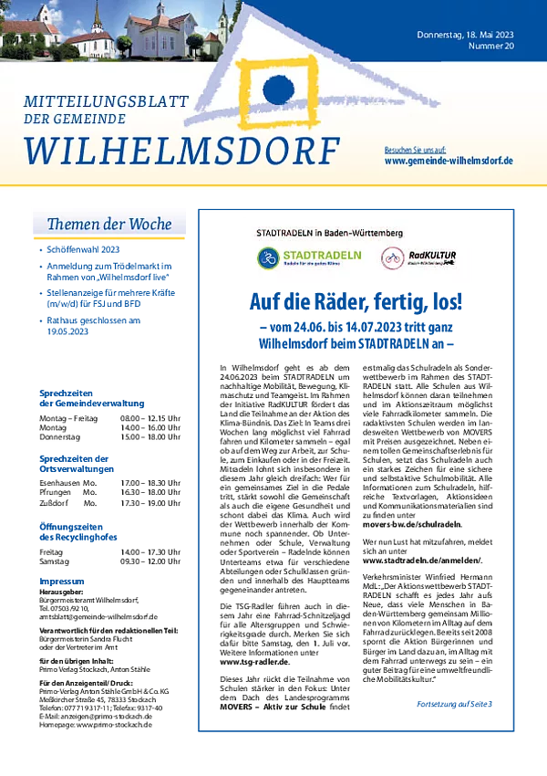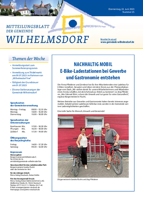 Gedruckt wird das Mitteilungsblatt vom Primo-Verlagsdruck, Stockach, Telefon 07771 9317-11. Bestellungen nimmt Frau Schneider, Telefon 07503 921-133 entgegen, Anzeigenaufträge richten Sie bitte an Frau Deuchert, Telefon 07503 921-111 oder per E-Mail an amtsblatt@gemeinde-wilhelmsdorf.de.