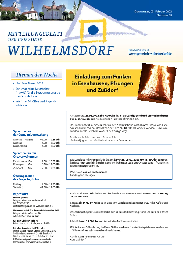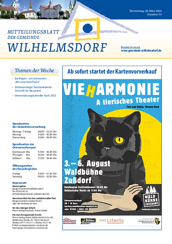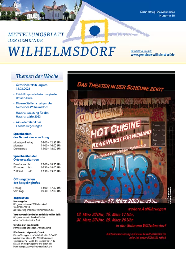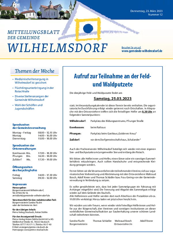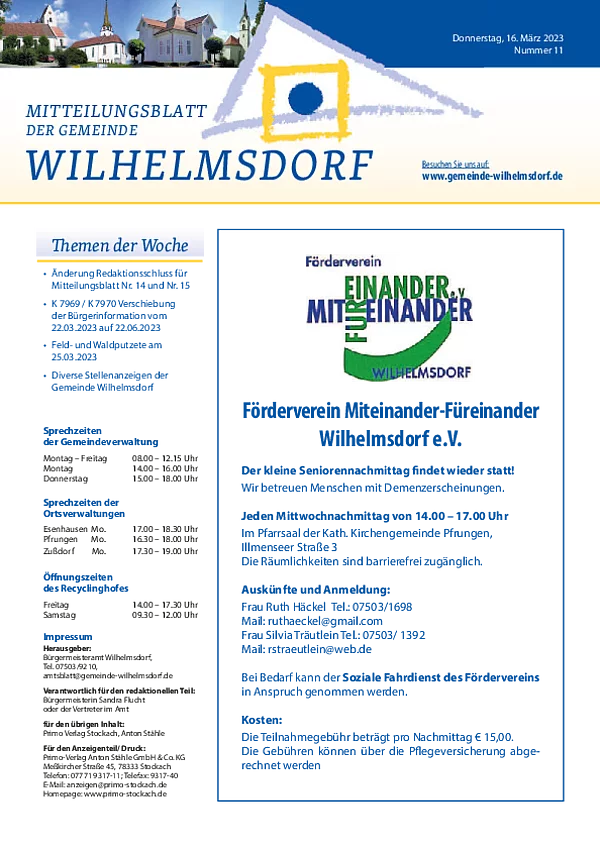 Gedruckt wird das Mitteilungsblatt vom Primo-Verlagsdruck, Stockach, Telefon 07771 9317-11. Bestellungen nimmt Frau Schneider, Telefon 07503 921-133 entgegen, Anzeigenaufträge richten Sie bitte an Frau Deuchert, Telefon 07503 921-111 oder per E-Mail an amtsblatt@gemeinde-wilhelmsdorf.de.