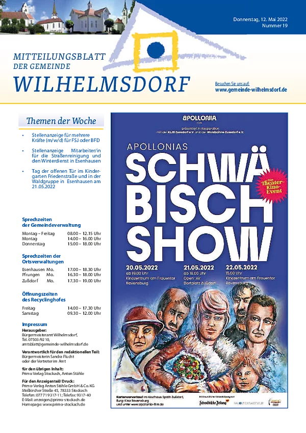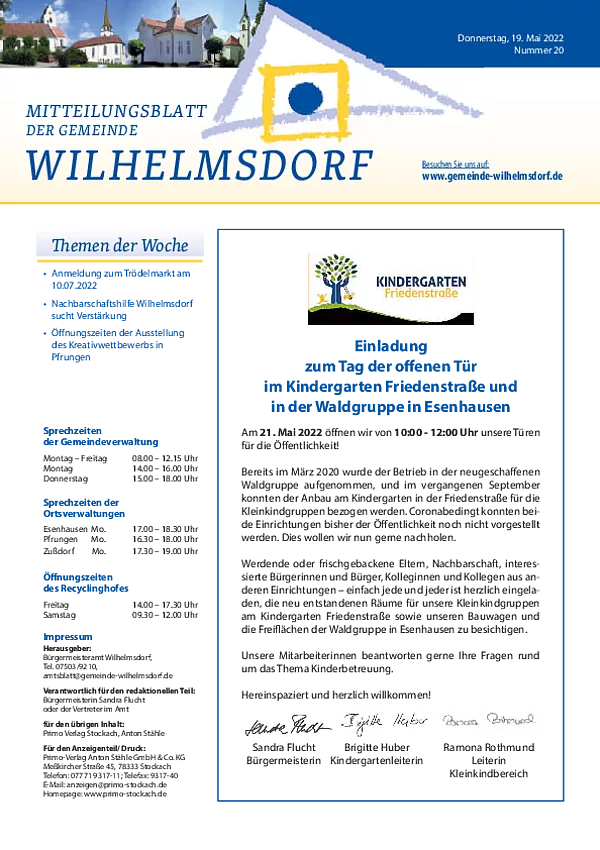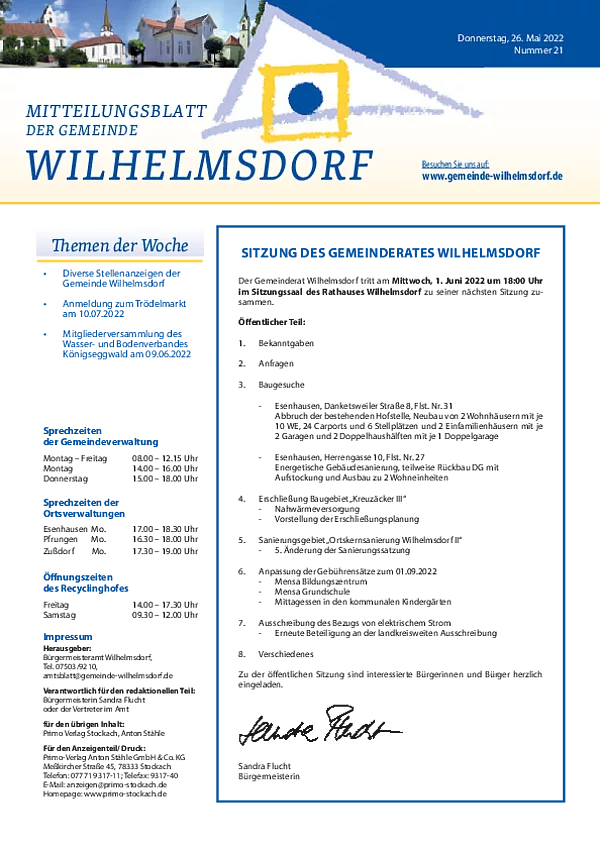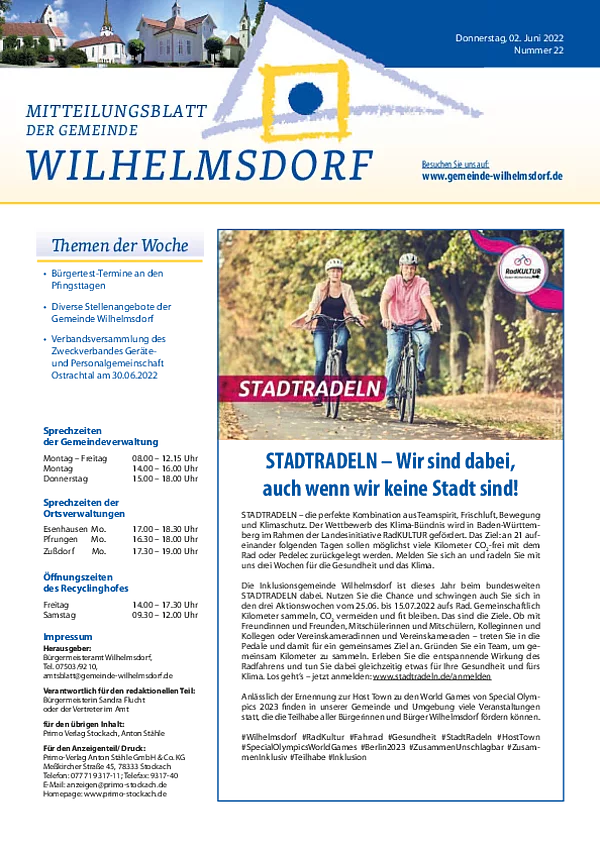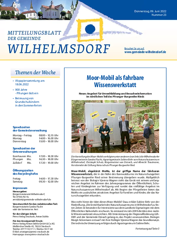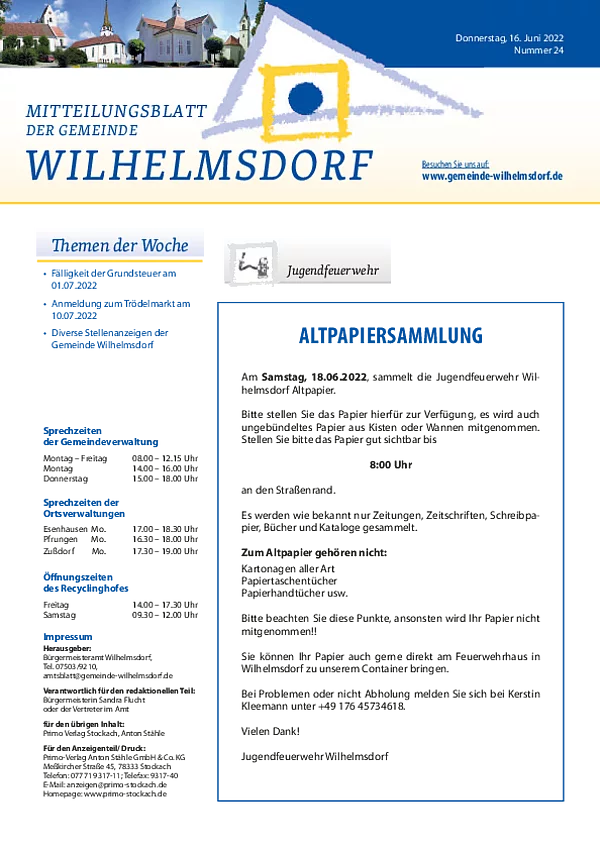 Gedruckt wird das Mitteilungsblatt vom Primo-Verlagsdruck, Stockach, Telefon 07771 9317-11. Bestellungen nimmt Frau Schneider, Telefon 07503 921-133 entgegen, Anzeigenaufträge richten Sie bitte an Frau Deuchert, Telefon 07503 921-111 oder per E-Mail an amtsblatt@gemeinde-wilhelmsdorf.de.