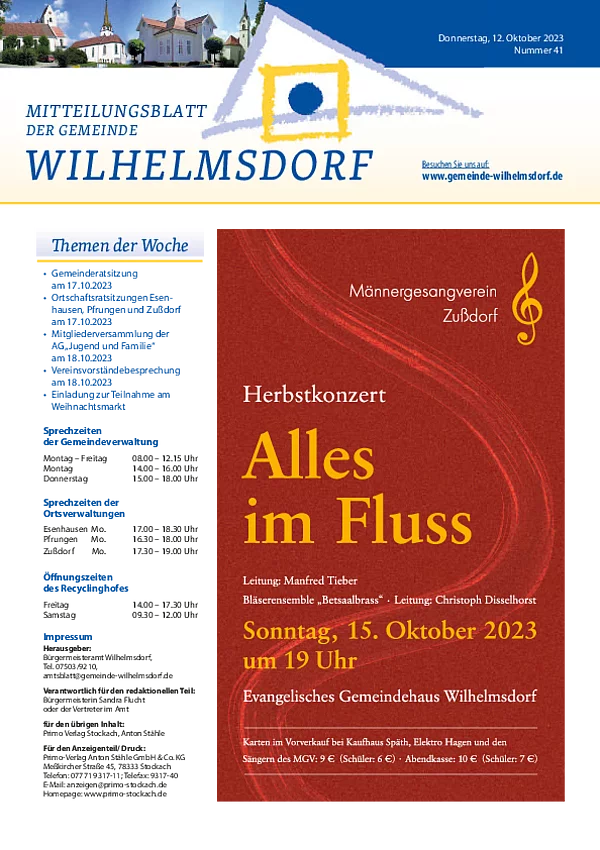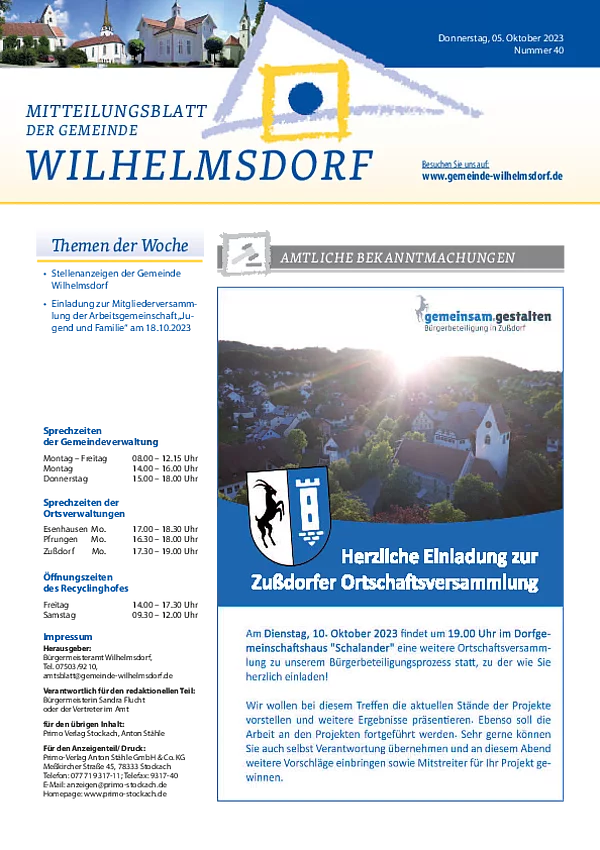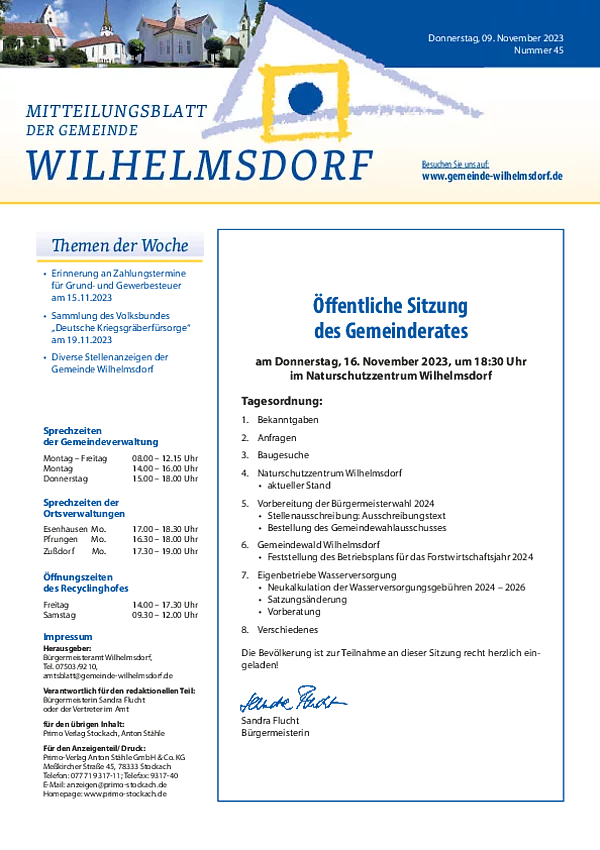 Gedruckt wird das Mitteilungsblatt vom Primo-Verlagsdruck, Stockach, Telefon 07771 9317-11. Bestellungen nimmt Frau Schneider, Telefon 07503 921-133 entgegen, Anzeigenaufträge richten Sie bitte an Frau Deuchert, Telefon 07503 921-111 oder per E-Mail an amtsblatt@gemeinde-wilhelmsdorf.de.