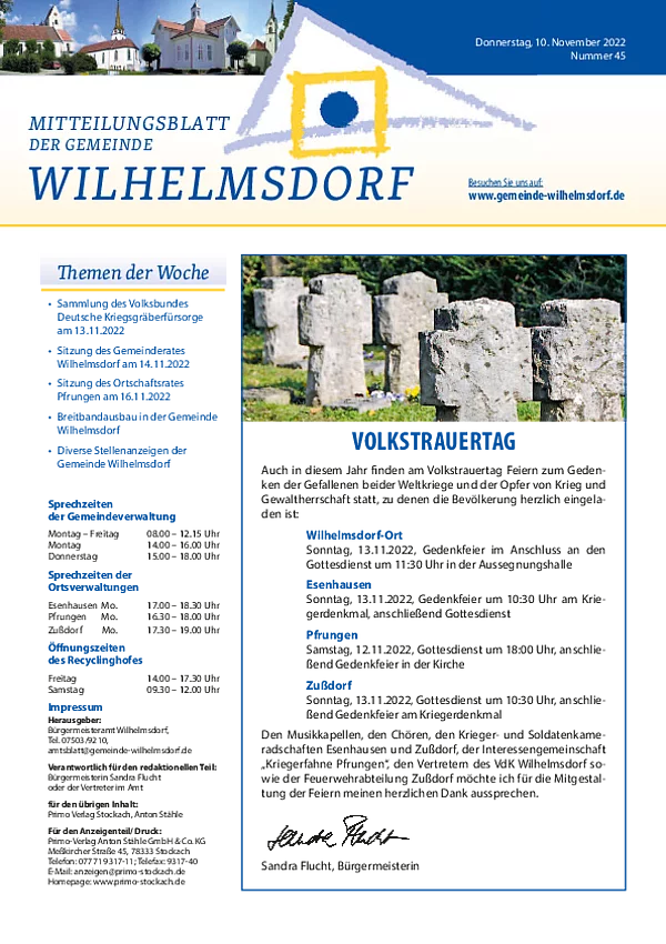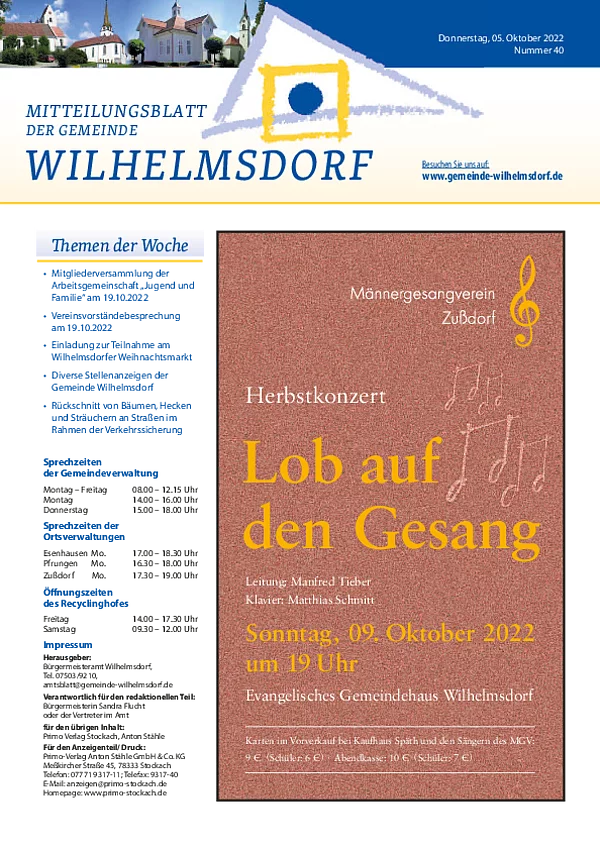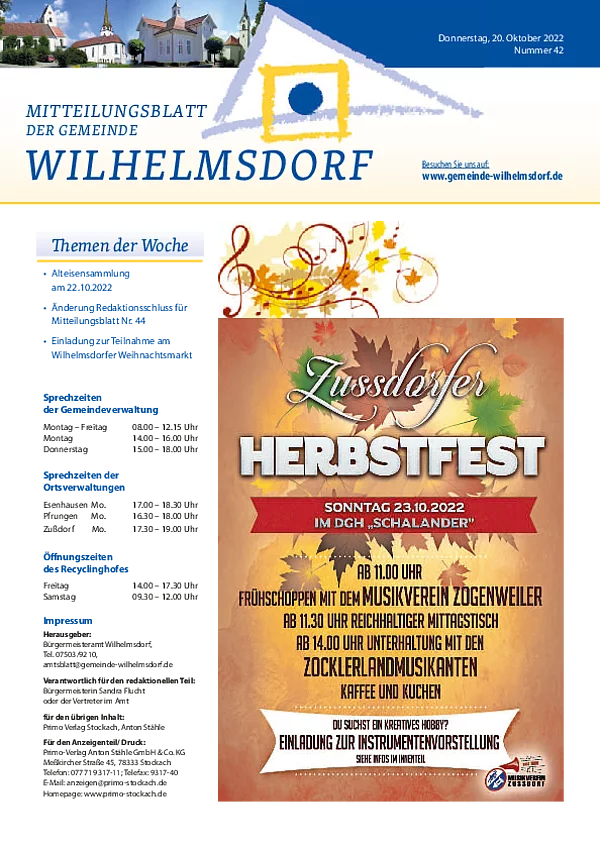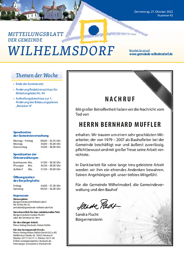 Gedruckt wird das Mitteilungsblatt vom Primo-Verlagsdruck, Stockach, Telefon 07771 9317-11. Bestellungen nimmt Frau Schneider, Telefon 07503 921-133 entgegen, Anzeigenaufträge richten Sie bitte an Frau Deuchert, Telefon 07503 921-111 oder per E-Mail an amtsblatt@gemeinde-wilhelmsdorf.de.