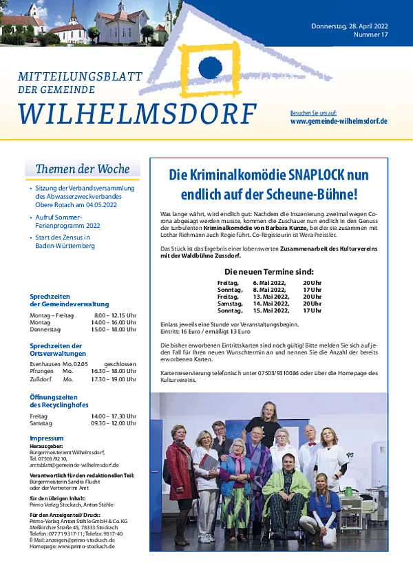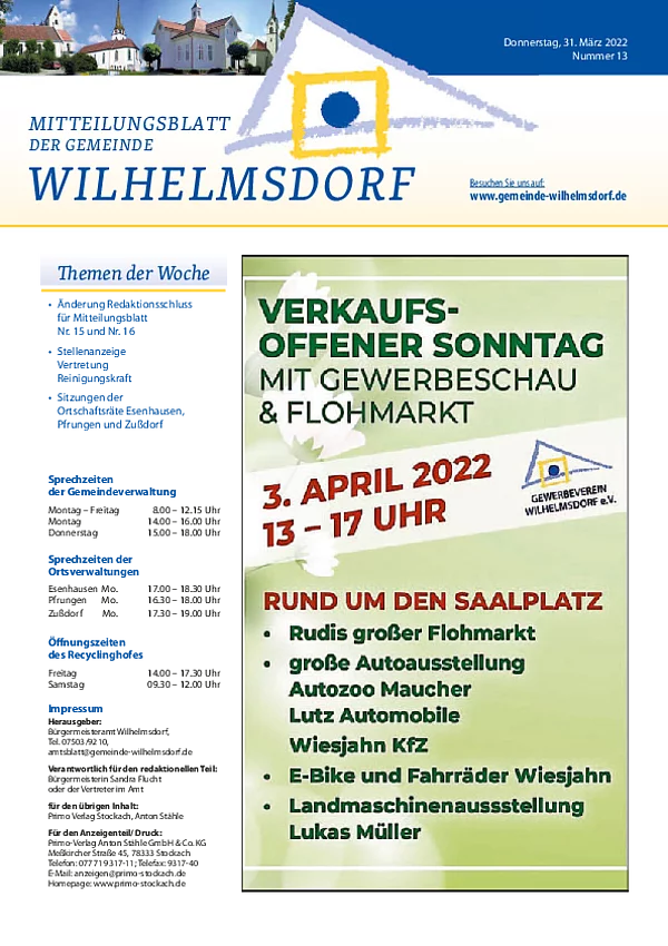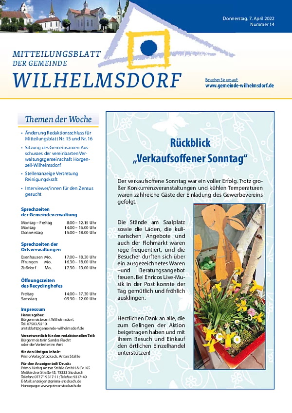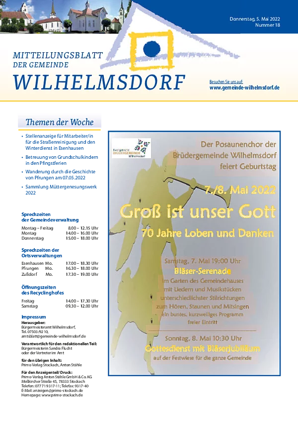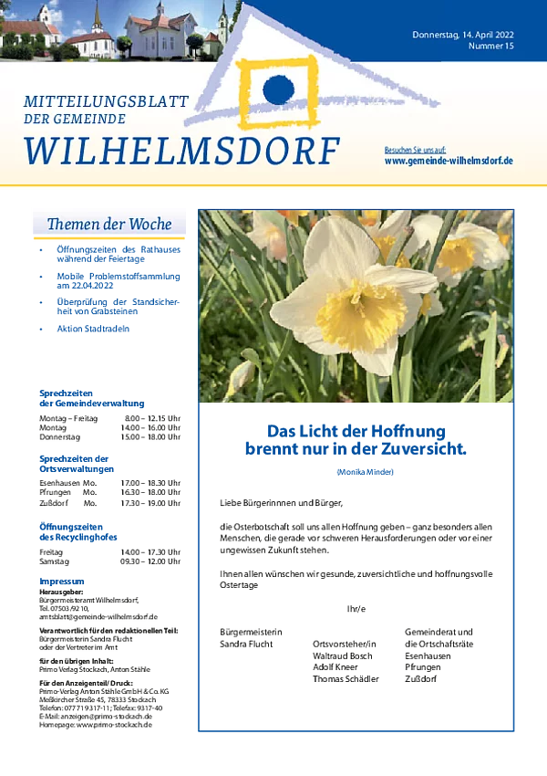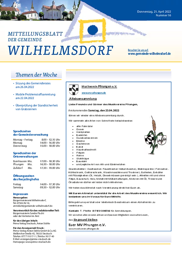 Gedruckt wird das Mitteilungsblatt vom Primo-Verlagsdruck, Stockach, Telefon 07771 9317-11. Bestellungen nimmt Frau Schneider, Telefon 07503 921-133 entgegen, Anzeigenaufträge richten Sie bitte an Frau Deuchert, Telefon 07503 921-111 oder per E-Mail an amtsblatt@gemeinde-wilhelmsdorf.de.