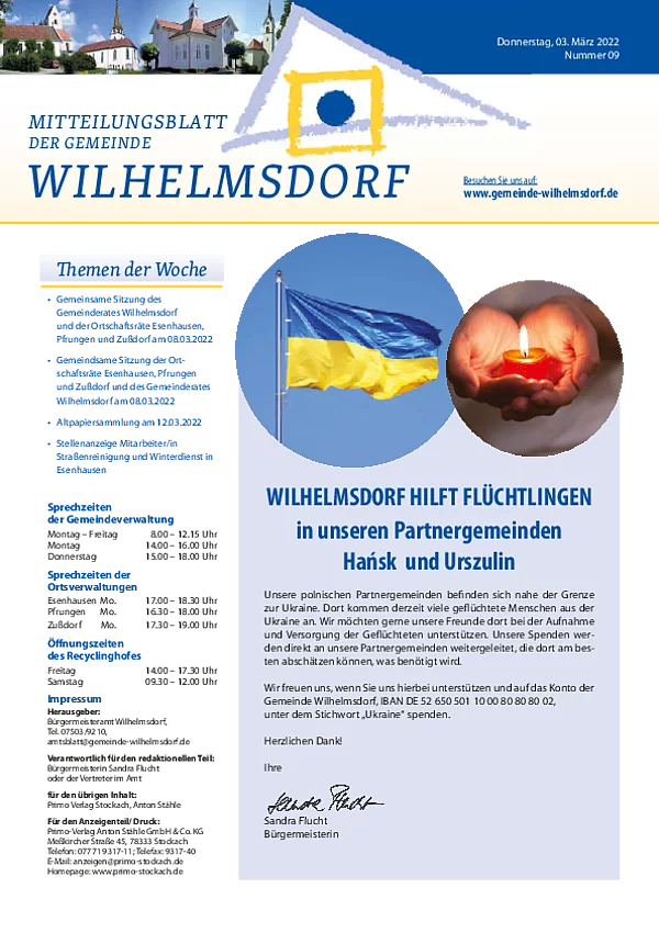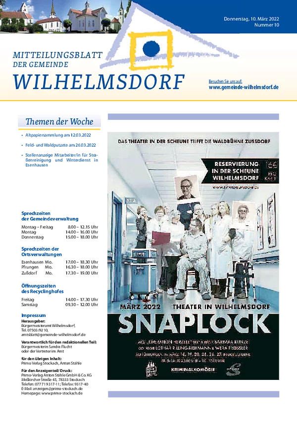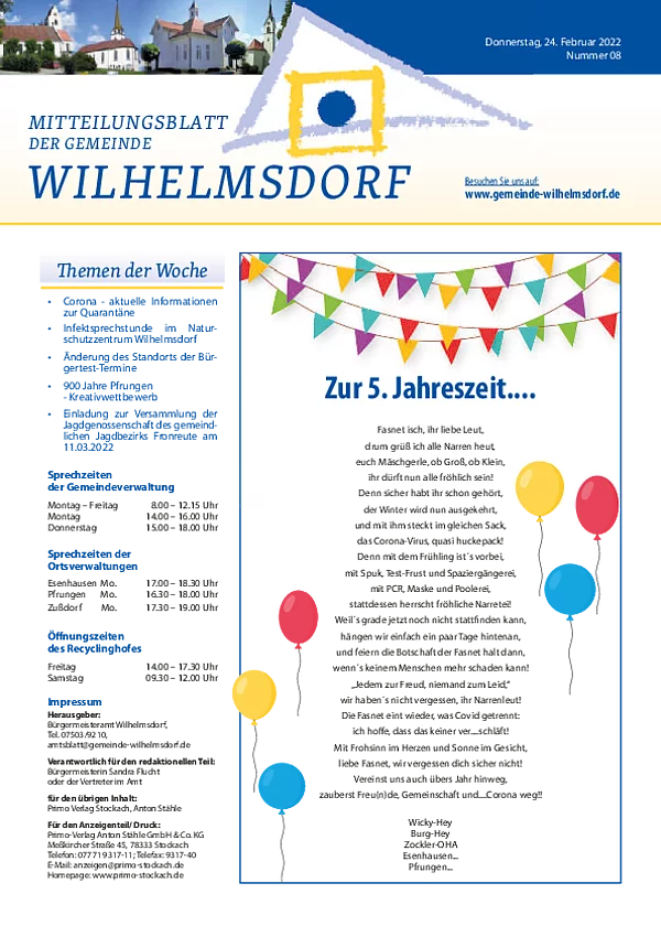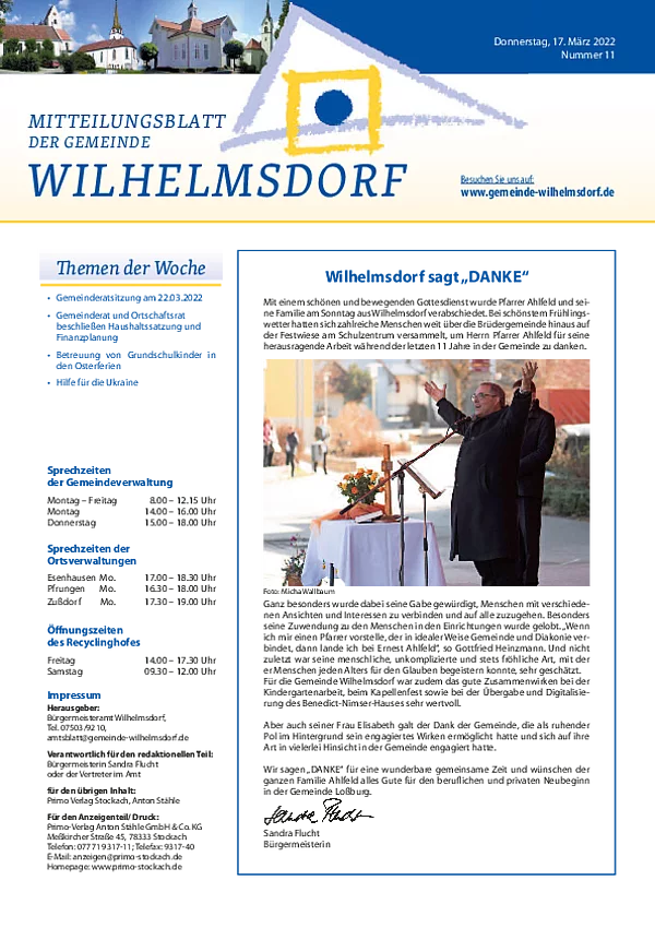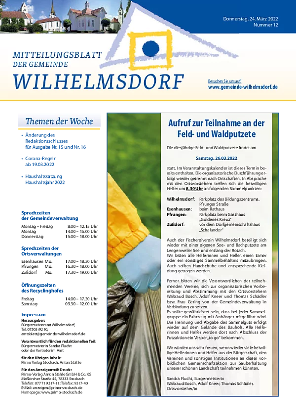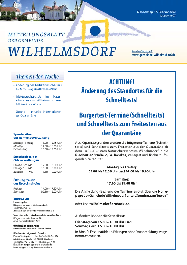 Gedruckt wird das Mitteilungsblatt vom Primo-Verlagsdruck, Stockach, Telefon 07771 9317-11. Bestellungen nimmt Frau Schneider, Telefon 07503 921-133 entgegen, Anzeigenaufträge richten Sie bitte an Frau Deuchert, Telefon 07503 921-111 oder per E-Mail an amtsblatt@gemeinde-wilhelmsdorf.de.