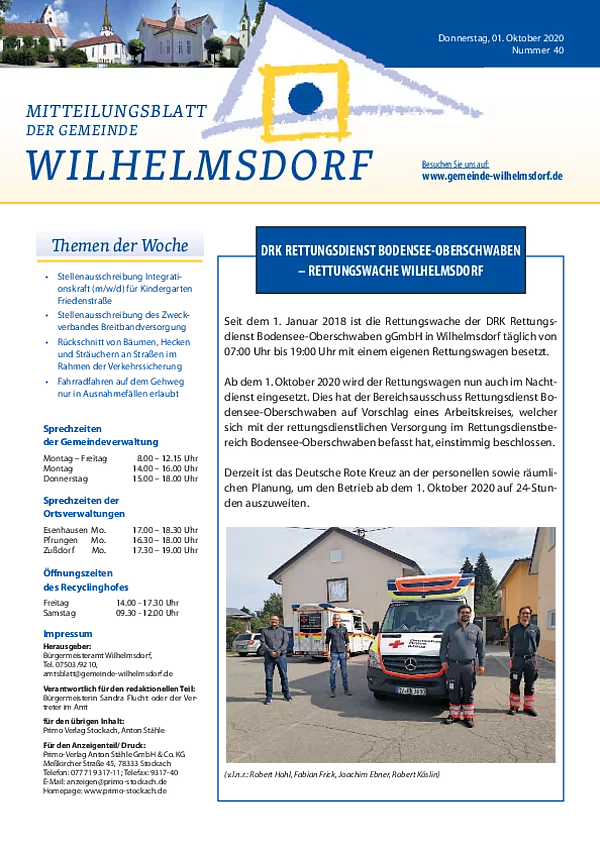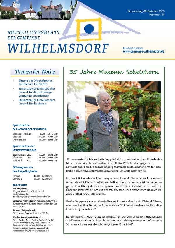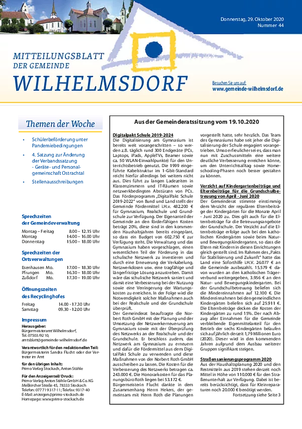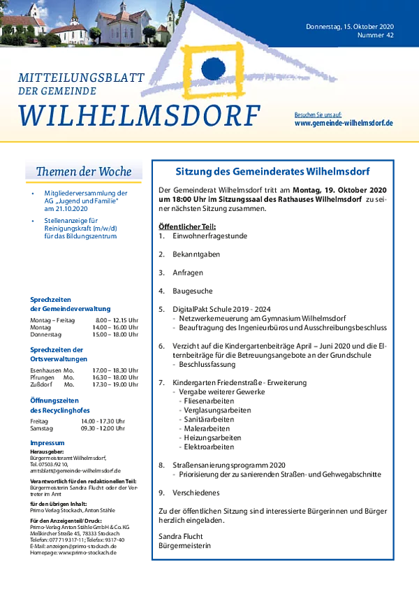 Gedruckt wird das Mitteilungsblatt vom Primo-Verlagsdruck, Stockach, Telefon 07771 9317-11. Bestellungen nimmt Frau Schneider, Telefon 07503 921-133 entgegen, Anzeigenaufträge richten Sie bitte an Frau Deuchert, Telefon 07503 921-111 oder per E-Mail an amtsblatt@gemeinde-wilhelmsdorf.de.