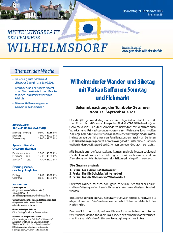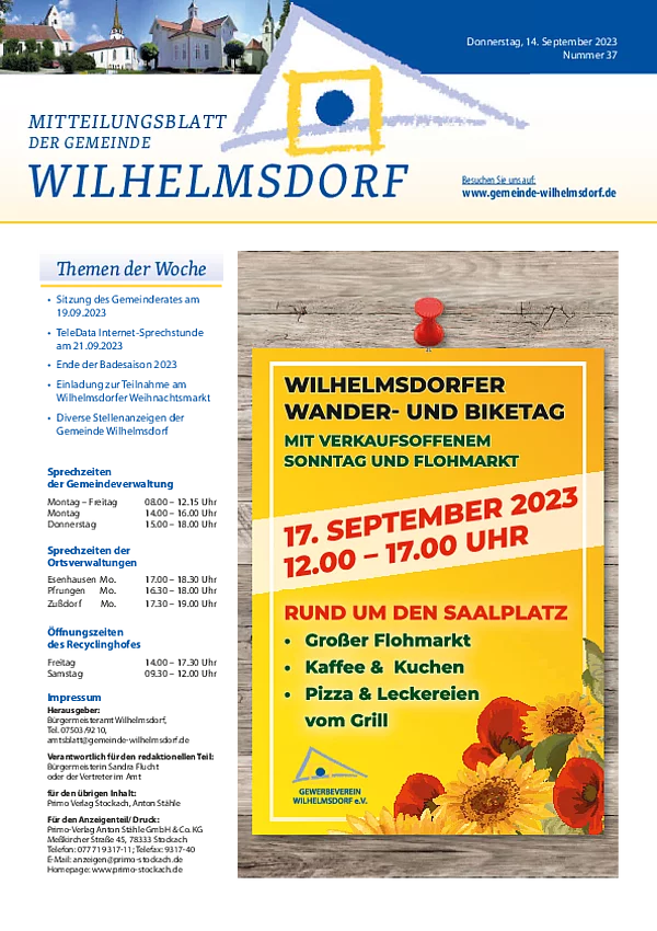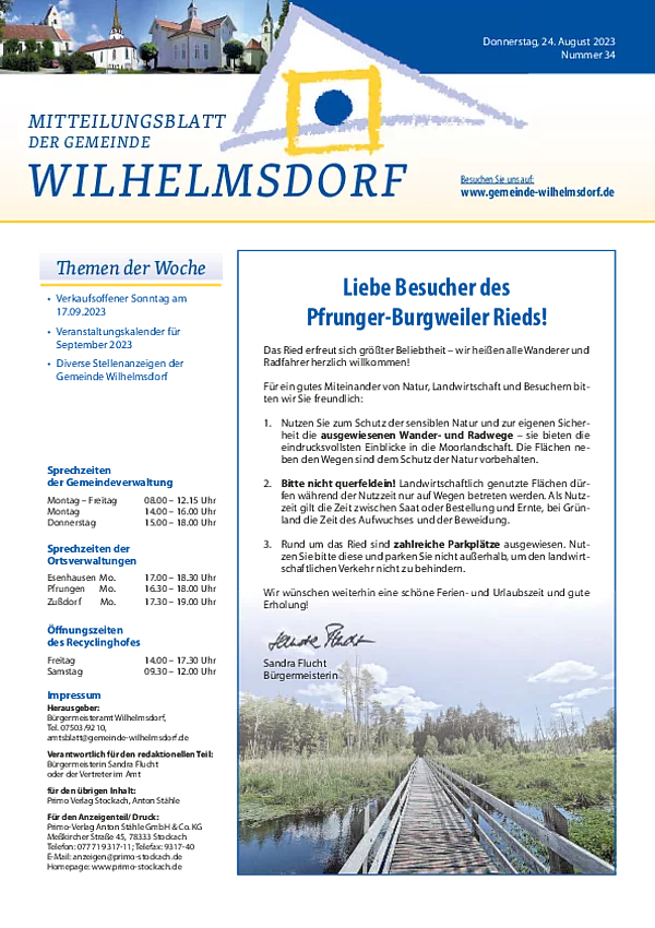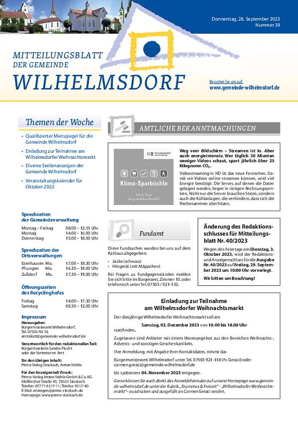 Gedruckt wird das Mitteilungsblatt vom Primo-Verlagsdruck, Stockach, Telefon 07771 9317-11. Bestellungen nimmt Frau Schneider, Telefon 07503 921-133 entgegen, Anzeigenaufträge richten Sie bitte an Frau Deuchert, Telefon 07503 921-111 oder per E-Mail an amtsblatt@gemeinde-wilhelmsdorf.de.