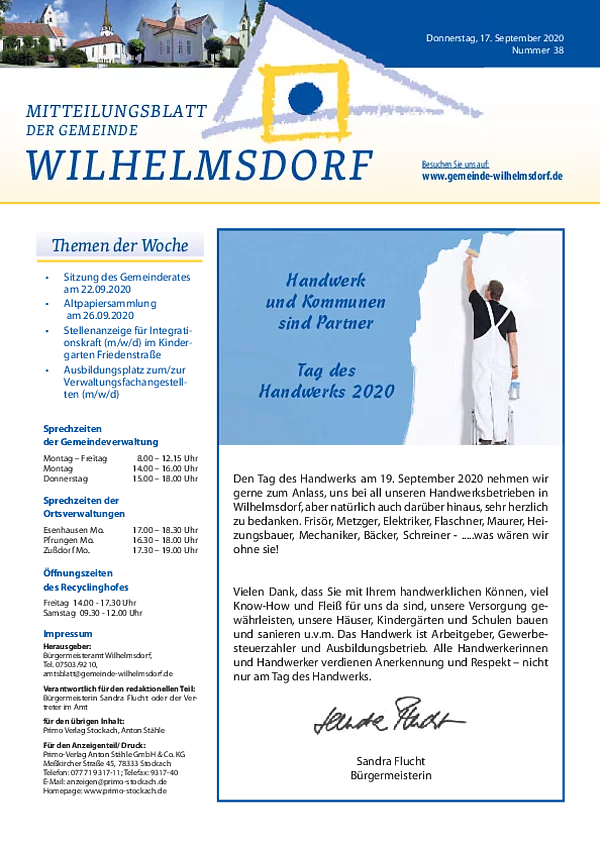 Gedruckt wird das Mitteilungsblatt vom Primo-Verlagsdruck, Stockach, Telefon 07771 9317-11. Bestellungen nimmt Frau Schneider, Telefon 07503 921-133 entgegen, Anzeigenaufträge richten Sie bitte an Frau Deuchert, Telefon 07503 921-111 oder per E-Mail an amtsblatt@gemeinde-wilhelmsdorf.de.