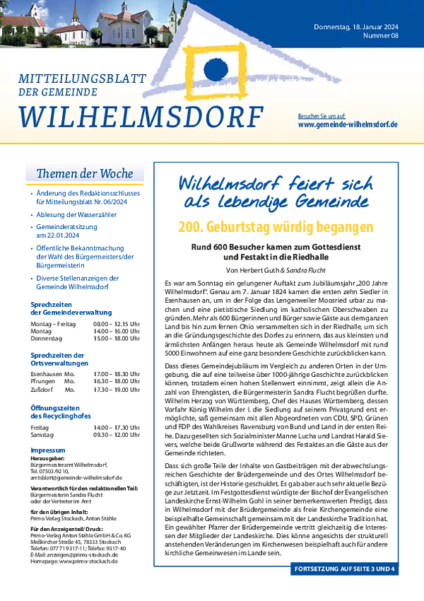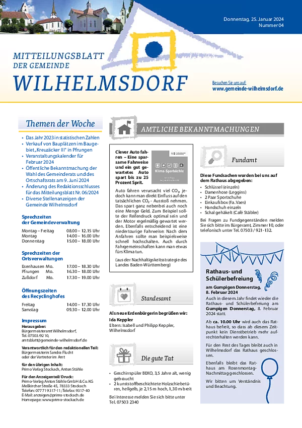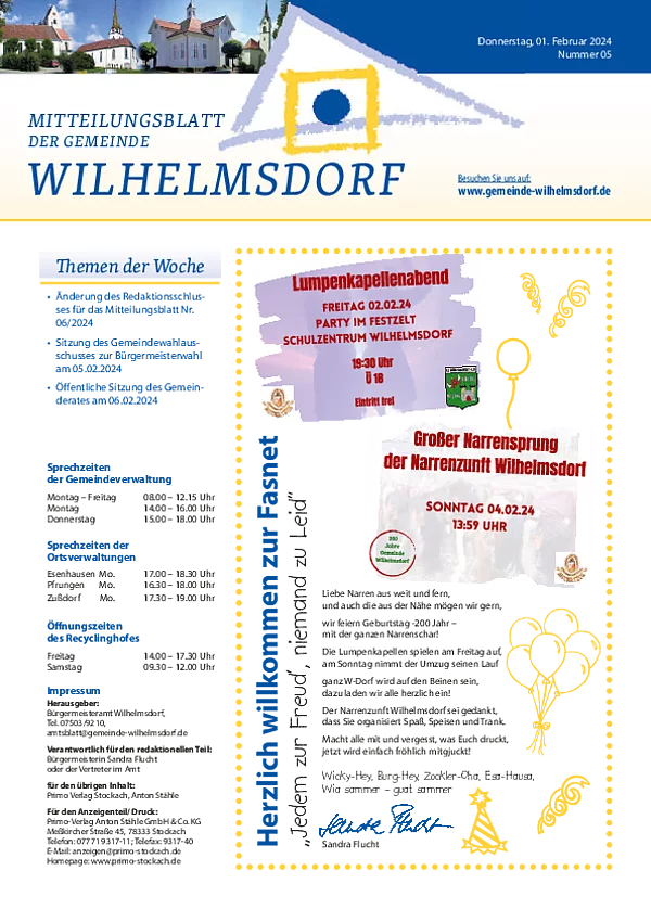 Gedruckt wird das Mitteilungsblatt vom Primo-Verlagsdruck, Stockach, Telefon 07771 9317-11. Bestellungen nimmt Frau Schneider, Telefon 07503 921-133 entgegen, Anzeigenaufträge richten Sie bitte an Frau Deuchert, Telefon 07503 921-111 oder per E-Mail an amtsblatt@gemeinde-wilhelmsdorf.de.
