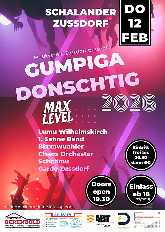 Freuen Sie sich auf verschiedene Liveacts mit Lumpenkapellen aus der Region und der Garde Zußdorf. Einlass ab 16 Jahren.