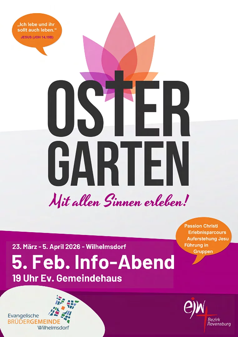 Wer im Ostergarten bei diesem tollen Gemeinschaftsprojekt mitwirken möchte - sei es bei der Durchführung von Ostergartenführungen, beim Auf- oder Abbau, im Bistro, beim Empfang, als Requisitenhelfer oder Kuchenbäcker/in, ist beim Info-Abend am 5. Februar herzlich willkommen!