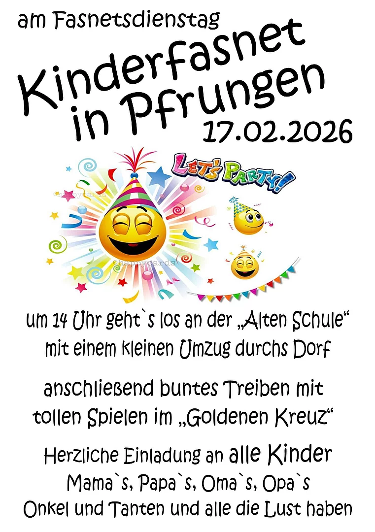 Kinderfasnet mit kleinem Umzug durchs Dorf und anschließender Party im "Gasthof zum Goldenen Kreuz". Treffpunkt zum Umzug um 14 Uhr bei der "Alten Schule"